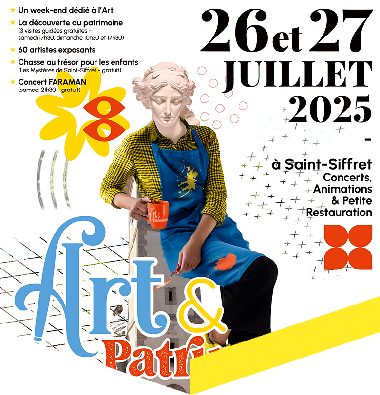 La MAIRIE de Saint-Siffret, en partenariat avec l’association TOUS EN SCENE Saint-Siffret, ont le plaisir de vous annoncer que la 5e édition du festival d'art contemporain Art & Patrimoine se déroulera les 26 et 27 juillet 2025 !